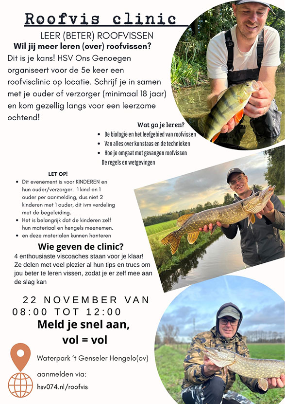 Zaterdag 22 november 8.00-12.00 uur geven wij, roofvissers van HSV Ons Genoegen, de clinic.